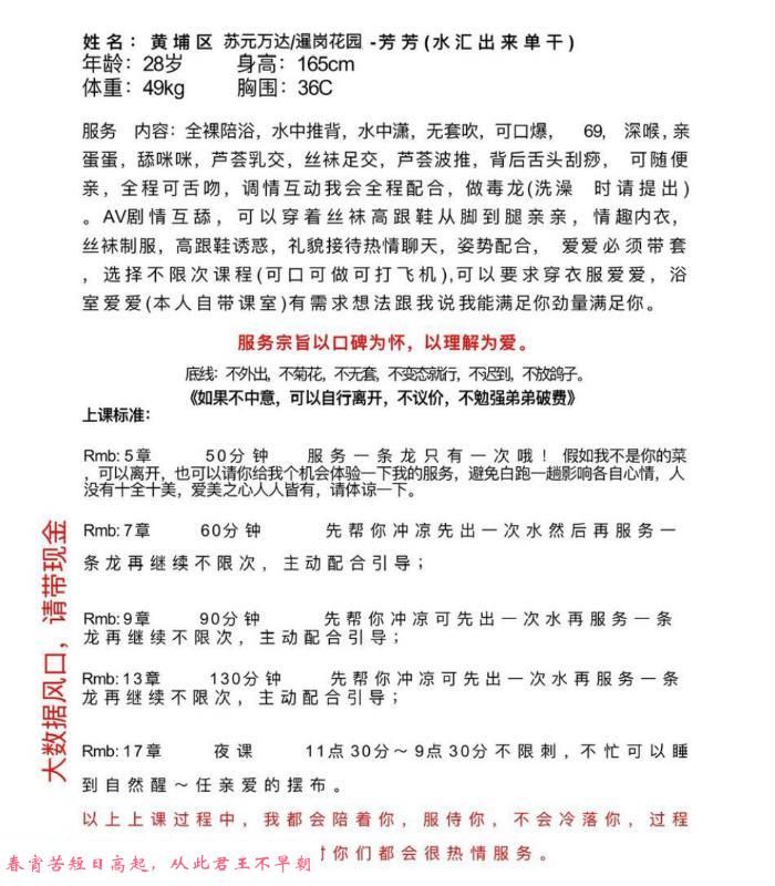 出来玩,态度第一,其他的都要排后面!芳芳就态度很好,非常热情,骚得你心痒痒!身材丰满,胸有c,口活无