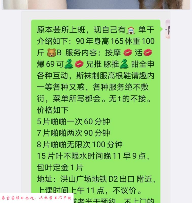 由于行业的特殊性,楼凤小姐或者商家联系方式更换比较频繁,同时如果这条信息被很多狼友浏览和添加,也会导致微信或者QQ联系方式被暂时屏蔽或者直接被封。如果你无法搜索QQ和微信,这个时候请你尝试一下手机联系方式,如果长期没回复或者联系方式失效且无法添加,请关注我们同城的其它最新信息即可,我们每日更新大量全国信息,通过我们的最新信息,总会帮你找到快乐和性福。